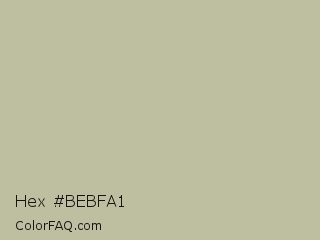 Hex #bebfa1 Color is a light yellow color and the nearest color is Bison Hide #c1b7a4. Hex code #bebfa1 and RGB value is rgb(190,191,161). In RGB color space, this color is composed of 75% red, 75% green, 63% blue, In CMYK color space, this color is composed of 1% cyan, 0% magenta, 16% yellow , 25% black , In HSL color space, this color has a hue angle of 62° , 19% saturation and 69% lightness.