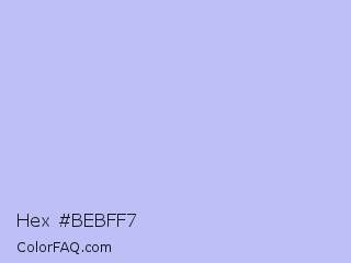 Hex #bebff7 Color is a very light blue color and the nearest color is Melrose #c7c1ff. Hex code #bebff7 and RGB value is rgb(190,191,247). In RGB color space, this color is composed of 75% red, 75% green, 97% blue, In CMYK color space, this color is composed of 23% cyan, 23% magenta, 0% yellow , 3% black , In HSL color space, this color has a hue angle of 239° , 78% saturation and 86% lightness.
