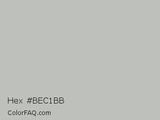 Hex #bec1bb Color is a light green color and the nearest color is Gray X11 Gray #bebebe. Hex code #bec1bb and RGB value is rgb(190,193,187). In RGB color space, this color is composed of 75% red, 76% green, 73% blue, In CMYK color space, this color is composed of 2% cyan, 0% magenta, 3% yellow , 24% black , In HSL color space, this color has a hue angle of 90° , 5% saturation and 75% lightness.