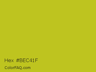Hex #bec41f Color is a normal yellow color and the nearest color is Key Lime Pie #bfc921. Hex code #bec41f and RGB value is rgb(190,196,31). In RGB color space, this color is composed of 75% red, 77% green, 12% blue, In CMYK color space, this color is composed of 3% cyan, 0% magenta, 84% yellow , 23% black , In HSL color space, this color has a hue angle of 62° , 73% saturation and 45% lightness.