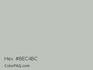 Hex #bec4bc Color is a light green color and the nearest color is Gray Nickel #c3c3bd. Hex code #bec4bc and RGB value is rgb(190,196,188). In RGB color space, this color is composed of 75% red, 77% green, 74% blue, In CMYK color space, this color is composed of 3% cyan, 0% magenta, 4% yellow , 23% black , In HSL color space, this color has a hue angle of 105° , 6% saturation and 75% lightness.
