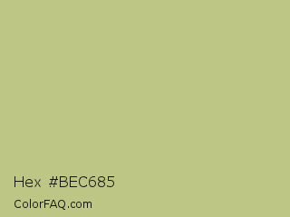 Hex #bec685 Color is a light yellow color and the nearest color is Sage #bcb88a. Hex code #bec685 and RGB value is rgb(190,198,133). In RGB color space, this color is composed of 75% red, 78% green, 52% blue, In CMYK color space, this color is composed of 4% cyan, 0% magenta, 33% yellow , 22% black , In HSL color space, this color has a hue angle of 67° , 36% saturation and 65% lightness.