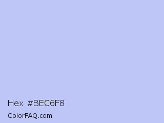 Hex #bec6f8 Color is a very light blue color and the nearest color is Melrose #c7c1ff. Hex code #bec6f8 and RGB value is rgb(190,198,248). In RGB color space, this color is composed of 75% red, 78% green, 97% blue, In CMYK color space, this color is composed of 23% cyan, 20% magenta, 0% yellow , 3% black , In HSL color space, this color has a hue angle of 232° , 81% saturation and 86% lightness.