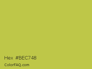 Hex #bec748 Color is a normal yellow color and the nearest color is Turmeric #cabb48. Hex code #bec748 and RGB value is rgb(190,199,72). In RGB color space, this color is composed of 75% red, 78% green, 28% blue, In CMYK color space, this color is composed of 5% cyan, 0% magenta, 64% yellow , 22% black , In HSL color space, this color has a hue angle of 64° , 53% saturation and 53% lightness.