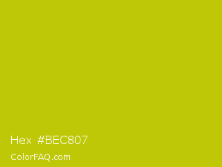 Hex #bec807 Color is a normal yellow color and the nearest color is Rio Grande #bbd009. Hex code #bec807 and RGB value is rgb(190,200,7). In RGB color space, this color is composed of 75% red, 78% green, 3% blue, In CMYK color space, this color is composed of 5% cyan, 0% magenta, 97% yellow , 22% black , In HSL color space, this color has a hue angle of 63° , 93% saturation and 41% lightness.