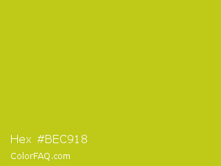 Hex #bec918 Color is a normal yellow color and the nearest color is Key Lime Pie #bfc921. Hex code #bec918 and RGB value is rgb(190,201,24). In RGB color space, this color is composed of 75% red, 79% green, 9% blue, In CMYK color space, this color is composed of 5% cyan, 0% magenta, 88% yellow , 21% black , In HSL color space, this color has a hue angle of 64° , 79% saturation and 44% lightness.