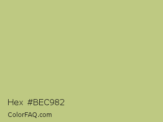 Hex #bec982 Color is a light yellow color and the nearest color is Pine Glade #c7cd90. Hex code #bec982 and RGB value is rgb(190,201,130). In RGB color space, this color is composed of 75% red, 79% green, 51% blue, In CMYK color space, this color is composed of 5% cyan, 0% magenta, 35% yellow , 21% black , In HSL color space, this color has a hue angle of 69° , 40% saturation and 65% lightness.