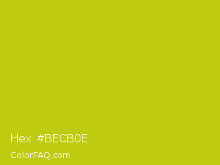 Hex #becb0e Color is a normal yellow color and the nearest color is Rio Grande #bbd009. Hex code #becb0e and RGB value is rgb(190,203,14). In RGB color space, this color is composed of 75% red, 80% green, 5% blue, In CMYK color space, this color is composed of 6% cyan, 0% magenta, 93% yellow , 20% black , In HSL color space, this color has a hue angle of 64° , 87% saturation and 43% lightness.