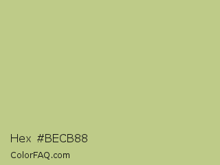 Hex #becb88 Color is a light lime color and the nearest color is Pine Glade #c7cd90. Hex code #becb88 and RGB value is rgb(190,203,136). In RGB color space, this color is composed of 75% red, 80% green, 53% blue, In CMYK color space, this color is composed of 6% cyan, 0% magenta, 33% yellow , 20% black , In HSL color space, this color has a hue angle of 72° , 39% saturation and 66% lightness.