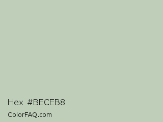 Hex #beceb8 Color is a light green color and the nearest color is Pale Leaf #c0d3b9. Hex code #beceb8 and RGB value is rgb(190,206,184). In RGB color space, this color is composed of 75% red, 81% green, 72% blue, In CMYK color space, this color is composed of 8% cyan, 0% magenta, 11% yellow , 19% black , In HSL color space, this color has a hue angle of 104° , 18% saturation and 76% lightness.