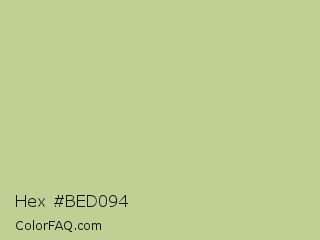 Hex #bed094 Color is a light lime color and the nearest color is Pine Glade #c7cd90. Hex code #bed094 and RGB value is rgb(190,208,148). In RGB color space, this color is composed of 75% red, 82% green, 58% blue, In CMYK color space, this color is composed of 9% cyan, 0% magenta, 29% yellow , 18% black , In HSL color space, this color has a hue angle of 78° , 39% saturation and 70% lightness.