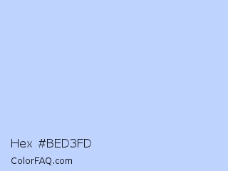 Hex #bed3fd Color is a very light blue color and the nearest color is Tropical Blue #c3ddf9. Hex code #bed3fd and RGB value is rgb(190,211,253). In RGB color space, this color is composed of 75% red, 83% green, 99% blue, In CMYK color space, this color is composed of 25% cyan, 17% magenta, 0% yellow , 1% black , In HSL color space, this color has a hue angle of 220° , 94% saturation and 87% lightness.
