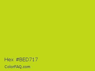 Hex #bed717 Color is a normal yellow color and the nearest color is Fuego #bede0d. Hex code #bed717 and RGB value is rgb(190,215,23). In RGB color space, this color is composed of 75% red, 84% green, 9% blue, In CMYK color space, this color is composed of 12% cyan, 0% magenta, 89% yellow , 16% black , In HSL color space, this color has a hue angle of 68° , 81% saturation and 47% lightness.