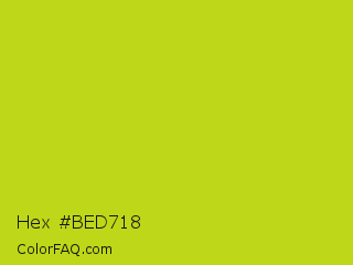 Hex #bed718 Color is a normal yellow color and the nearest color is Fuego #bede0d. Hex code #bed718 and RGB value is rgb(190,215,24). In RGB color space, this color is composed of 75% red, 84% green, 9% blue, In CMYK color space, this color is composed of 12% cyan, 0% magenta, 89% yellow , 16% black , In HSL color space, this color has a hue angle of 68° , 80% saturation and 47% lightness.
