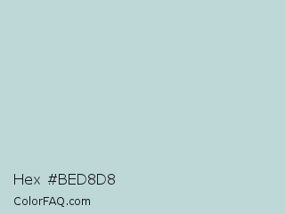 Hex #bed8d8 Color is a light cyan color and the nearest color is Ziggurat #bfdbe2. Hex code #bed8d8 and RGB value is rgb(190,216,216). In RGB color space, this color is composed of 75% red, 85% green, 85% blue, In CMYK color space, this color is composed of 12% cyan, 0% magenta, 0% yellow , 15% black , In HSL color space, this color has a hue angle of 180° , 25% saturation and 80% lightness.