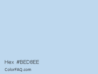 Hex #bed8ee Color is a very light blue color and the nearest color is Pale Aqua #bcd4e6. Hex code #bed8ee and RGB value is rgb(190,216,238). In RGB color space, this color is composed of 75% red, 85% green, 93% blue, In CMYK color space, this color is composed of 20% cyan, 9% magenta, 0% yellow , 7% black , In HSL color space, this color has a hue angle of 208° , 59% saturation and 84% lightness.