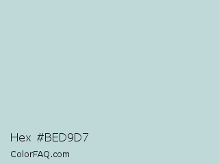 Hex #bed9d7 Color is a light cyan color and the nearest color is Tiara #c3d1d1. Hex code #bed9d7 and RGB value is rgb(190,217,215). In RGB color space, this color is composed of 75% red, 85% green, 84% blue, In CMYK color space, this color is composed of 12% cyan, 0% magenta, 1% yellow , 15% black , In HSL color space, this color has a hue angle of 176° , 26% saturation and 80% lightness.