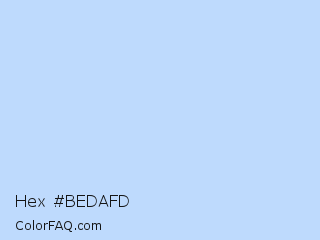 Hex #bedafd Color is a very light blue color and the nearest color is Tropical Blue #c3ddf9. Hex code #bedafd and RGB value is rgb(190,218,253). In RGB color space, this color is composed of 75% red, 85% green, 99% blue, In CMYK color space, this color is composed of 25% cyan, 14% magenta, 0% yellow , 1% black , In HSL color space, this color has a hue angle of 213° , 94% saturation and 87% lightness.