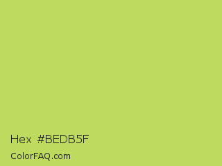 Hex #bedb5f Color is a light lime color and the nearest color is June Bud #bdda57. Hex code #bedb5f and RGB value is rgb(190,219,95). In RGB color space, this color is composed of 75% red, 86% green, 37% blue, In CMYK color space, this color is composed of 13% cyan, 0% magenta, 57% yellow , 14% black , In HSL color space, this color has a hue angle of 74° , 63% saturation and 62% lightness.