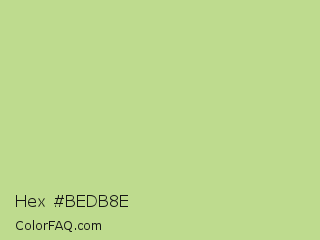 Hex #bedb8e Color is a light green color and the nearest color is Medium Spring Bud #c9dc87. Hex code #bedb8e and RGB value is rgb(190,219,142). In RGB color space, this color is composed of 75% red, 86% green, 56% blue, In CMYK color space, this color is composed of 13% cyan, 0% magenta, 35% yellow , 14% black , In HSL color space, this color has a hue angle of 83° , 52% saturation and 71% lightness.