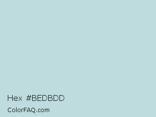 Hex #bedbdd Color is a very light cyan color and the nearest color is Ziggurat #bfdbe2. Hex code #bedbdd and RGB value is rgb(190,219,221). In RGB color space, this color is composed of 75% red, 86% green, 87% blue, In CMYK color space, this color is composed of 14% cyan, 1% magenta, 0% yellow , 13% black , In HSL color space, this color has a hue angle of 184° , 31% saturation and 81% lightness.