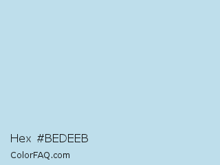 Hex #bedeeb Color is a very light blue color and the nearest color is Ziggurat #bfdbe2. Hex code #bedeeb and RGB value is rgb(190,222,235). In RGB color space, this color is composed of 75% red, 87% green, 92% blue, In CMYK color space, this color is composed of 19% cyan, 6% magenta, 0% yellow , 8% black , In HSL color space, this color has a hue angle of 197° , 53% saturation and 83% lightness.