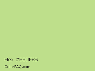 Hex #bedf8b Color is a light green color and the nearest color is Medium Spring Bud #c9dc87. Hex code #bedf8b and RGB value is rgb(190,223,139). In RGB color space, this color is composed of 75% red, 87% green, 55% blue, In CMYK color space, this color is composed of 15% cyan, 0% magenta, 38% yellow , 13% black , In HSL color space, this color has a hue angle of 84° , 57% saturation and 71% lightness.