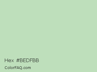 Hex #bedfbb Color is a light green color and the nearest color is Pixie Green #c0d8b6. Hex code #bedfbb and RGB value is rgb(190,223,187). In RGB color space, this color is composed of 75% red, 87% green, 73% blue, In CMYK color space, this color is composed of 15% cyan, 0% magenta, 16% yellow , 13% black , In HSL color space, this color has a hue angle of 115° , 36% saturation and 80% lightness.