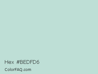Hex #bedfd6 Color is a very light cyan color and the nearest color is Edgewater #c8e3d7. Hex code #bedfd6 and RGB value is rgb(190,223,214). In RGB color space, this color is composed of 75% red, 87% green, 84% blue, In CMYK color space, this color is composed of 15% cyan, 0% magenta, 4% yellow , 13% black , In HSL color space, this color has a hue angle of 164° , 34% saturation and 81% lightness.