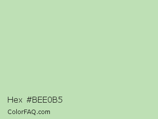 Hex #bee0b5 Color is a light green color and the nearest color is Pixie Green #c0d8b6. Hex code #bee0b5 and RGB value is rgb(190,224,181). In RGB color space, this color is composed of 75% red, 88% green, 71% blue, In CMYK color space, this color is composed of 15% cyan, 0% magenta, 19% yellow , 12% black , In HSL color space, this color has a hue angle of 107° , 41% saturation and 79% lightness.
