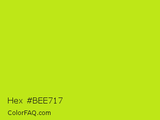 Hex #bee717 Color is a normal lime color and the nearest color is Las Palmas #c6e610. Hex code #bee717 and RGB value is rgb(190,231,23). In RGB color space, this color is composed of 75% red, 91% green, 9% blue, In CMYK color space, this color is composed of 18% cyan, 0% magenta, 90% yellow , 9% black , In HSL color space, this color has a hue angle of 72° , 82% saturation and 50% lightness.