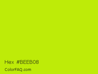 Hex #beeb08 Color is a normal lime color and the nearest color is Las Palmas #c6e610. Hex code #beeb08 and RGB value is rgb(190,235,8). In RGB color space, this color is composed of 75% red, 92% green, 3% blue, In CMYK color space, this color is composed of 19% cyan, 0% magenta, 97% yellow , 8% black , In HSL color space, this color has a hue angle of 72° , 93% saturation and 48% lightness.