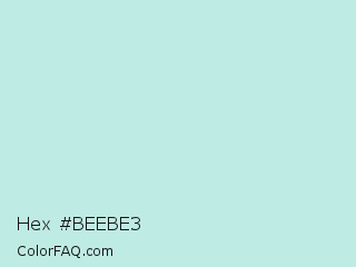 Hex #beebe3 Color is a very light cyan color and the nearest color is Jagged Ice #c2e8e5. Hex code #beebe3 and RGB value is rgb(190,235,227). In RGB color space, this color is composed of 75% red, 92% green, 89% blue, In CMYK color space, this color is composed of 19% cyan, 0% magenta, 3% yellow , 8% black , In HSL color space, this color has a hue angle of 169° , 53% saturation and 83% lightness.