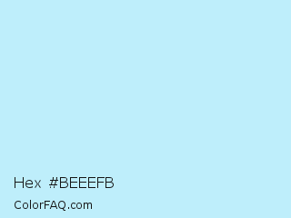 Hex #beeefb Color is a very light cyan color and the nearest color is French Pass #bdedfd. Hex code #beeefb and RGB value is rgb(190,238,251). In RGB color space, this color is composed of 75% red, 93% green, 98% blue, In CMYK color space, this color is composed of 24% cyan, 5% magenta, 0% yellow , 2% black , In HSL color space, this color has a hue angle of 193° , 88% saturation and 86% lightness.