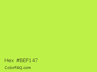 Hex #bef147 Color is a light lime color and the nearest color is Inchworm #b2ec5d. Hex code #bef147 and RGB value is rgb(190,241,71). In RGB color space, this color is composed of 75% red, 95% green, 28% blue, In CMYK color space, this color is composed of 21% cyan, 0% magenta, 71% yellow , 5% black , In HSL color space, this color has a hue angle of 78° , 86% saturation and 61% lightness.