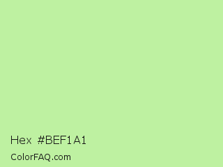 Hex #bef1a1 Color is a light green color and the nearest color is Reef #c9ffa2. Hex code #bef1a1 and RGB value is rgb(190,241,161). In RGB color space, this color is composed of 75% red, 95% green, 63% blue, In CMYK color space, this color is composed of 21% cyan, 0% magenta, 33% yellow , 5% black , In HSL color space, this color has a hue angle of 98° , 74% saturation and 79% lightness.