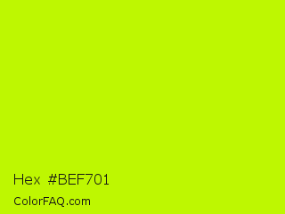 Hex #bef701 Color is a normal lime color and the nearest color is Lime #bfff00. Hex code #bef701 and RGB value is rgb(190,247,1). In RGB color space, this color is composed of 75% red, 97% green, 0% blue, In CMYK color space, this color is composed of 23% cyan, 0% magenta, 100% yellow , 3% black , In HSL color space, this color has a hue angle of 74° , 99% saturation and 49% lightness.