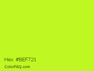 Hex #bef721 Color is a normal lime color and the nearest color is Green Yellow #adff2f. Hex code #bef721 and RGB value is rgb(190,247,33). In RGB color space, this color is composed of 75% red, 97% green, 13% blue, In CMYK color space, this color is composed of 23% cyan, 0% magenta, 87% yellow , 3% black , In HSL color space, this color has a hue angle of 76° , 93% saturation and 55% lightness.