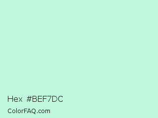 Hex #bef7dc Color is a very light green color and the nearest color is Cruise #b5ecdf. Hex code #bef7dc and RGB value is rgb(190,247,220). In RGB color space, this color is composed of 75% red, 97% green, 86% blue, In CMYK color space, this color is composed of 23% cyan, 0% magenta, 11% yellow , 3% black , In HSL color space, this color has a hue angle of 152° , 78% saturation and 86% lightness.