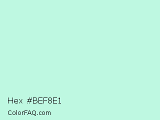 Hex #bef8e1 Color is a very light green color and the nearest color is Mint Tulip #c4f4eb. Hex code #bef8e1 and RGB value is rgb(190,248,225). In RGB color space, this color is composed of 75% red, 97% green, 88% blue, In CMYK color space, this color is composed of 23% cyan, 0% magenta, 9% yellow , 3% black , In HSL color space, this color has a hue angle of 156° , 81% saturation and 86% lightness.