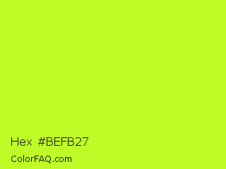 Hex #befb27 Color is a normal lime color and the nearest color is Green Yellow #adff2f. Hex code #befb27 and RGB value is rgb(190,251,39). In RGB color space, this color is composed of 75% red, 98% green, 15% blue, In CMYK color space, this color is composed of 24% cyan, 0% magenta, 84% yellow , 2% black , In HSL color space, this color has a hue angle of 77° , 96% saturation and 57% lightness.