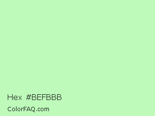 Hex #befbbb Color is a very light green color and the nearest color is Madang #b7f0be. Hex code #befbbb and RGB value is rgb(190,251,187). In RGB color space, this color is composed of 75% red, 98% green, 73% blue, In CMYK color space, this color is composed of 24% cyan, 0% magenta, 25% yellow , 2% black , In HSL color space, this color has a hue angle of 117° , 89% saturation and 86% lightness.