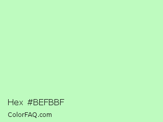Hex #befbbf Color is a very light green color and the nearest color is Madang #b7f0be. Hex code #befbbf and RGB value is rgb(190,251,191). In RGB color space, this color is composed of 75% red, 98% green, 75% blue, In CMYK color space, this color is composed of 24% cyan, 0% magenta, 24% yellow , 2% black , In HSL color space, this color has a hue angle of 121° , 88% saturation and 86% lightness.