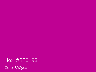 Hex #bf0193 Color is a normal magenta color and the nearest color is Red Violet #c71585. Hex code #bf0193 and RGB value is rgb(191,1,147). In RGB color space, this color is composed of 75% red, 0% green, 58% blue, In CMYK color space, this color is composed of 0% cyan, 99% magenta, 23% yellow , 25% black , In HSL color space, this color has a hue angle of 314° , 99% saturation and 38% lightness.