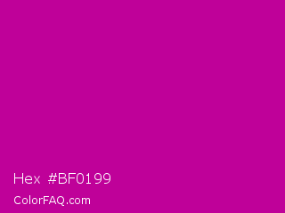 Hex #bf0199 Color is a normal magenta color and the nearest color is Red Violet #c71585. Hex code #bf0199 and RGB value is rgb(191,1,153). In RGB color space, this color is composed of 75% red, 0% green, 60% blue, In CMYK color space, this color is composed of 0% cyan, 99% magenta, 20% yellow , 25% black , In HSL color space, this color has a hue angle of 312° , 99% saturation and 38% lightness.