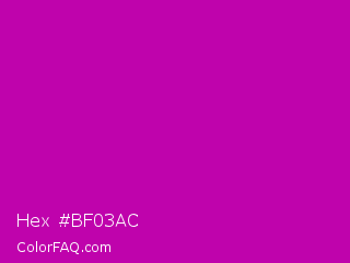 Hex #bf03ac Color is a normal magenta color and the nearest color is Heliotrope Magenta #aa00bb. Hex code #bf03ac and RGB value is rgb(191,3,172). In RGB color space, this color is composed of 75% red, 1% green, 67% blue, In CMYK color space, this color is composed of 0% cyan, 98% magenta, 10% yellow , 25% black , In HSL color space, this color has a hue angle of 306° , 97% saturation and 38% lightness.