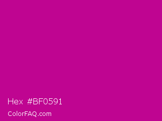 Hex #bf0591 Color is a normal magenta color and the nearest color is Red Violet #c71585. Hex code #bf0591 and RGB value is rgb(191,5,145). In RGB color space, this color is composed of 75% red, 2% green, 57% blue, In CMYK color space, this color is composed of 0% cyan, 97% magenta, 24% yellow , 25% black , In HSL color space, this color has a hue angle of 315° , 95% saturation and 38% lightness.