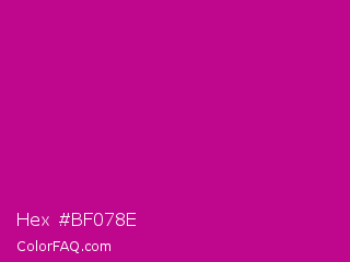 Hex #bf078e Color is a normal magenta color and the nearest color is Red Violet #c71585. Hex code #bf078e and RGB value is rgb(191,7,142). In RGB color space, this color is composed of 75% red, 3% green, 56% blue, In CMYK color space, this color is composed of 0% cyan, 96% magenta, 26% yellow , 25% black , In HSL color space, this color has a hue angle of 316° , 93% saturation and 39% lightness.