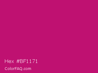 Hex #bf1171 Color is a normal magenta color and the nearest color is Magenta Dye #ca1f7b. Hex code #bf1171 and RGB value is rgb(191,17,113). In RGB color space, this color is composed of 75% red, 7% green, 44% blue, In CMYK color space, this color is composed of 0% cyan, 91% magenta, 41% yellow , 25% black , In HSL color space, this color has a hue angle of 327° , 84% saturation and 41% lightness.
