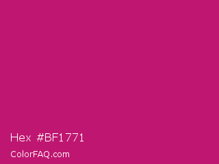 Hex #bf1771 Color is a normal rose color and the nearest color is Magenta Dye #ca1f7b. Hex code #bf1771 and RGB value is rgb(191,23,113). In RGB color space, this color is composed of 75% red, 9% green, 44% blue, In CMYK color space, this color is composed of 0% cyan, 88% magenta, 41% yellow , 25% black , In HSL color space, this color has a hue angle of 328° , 79% saturation and 42% lightness.